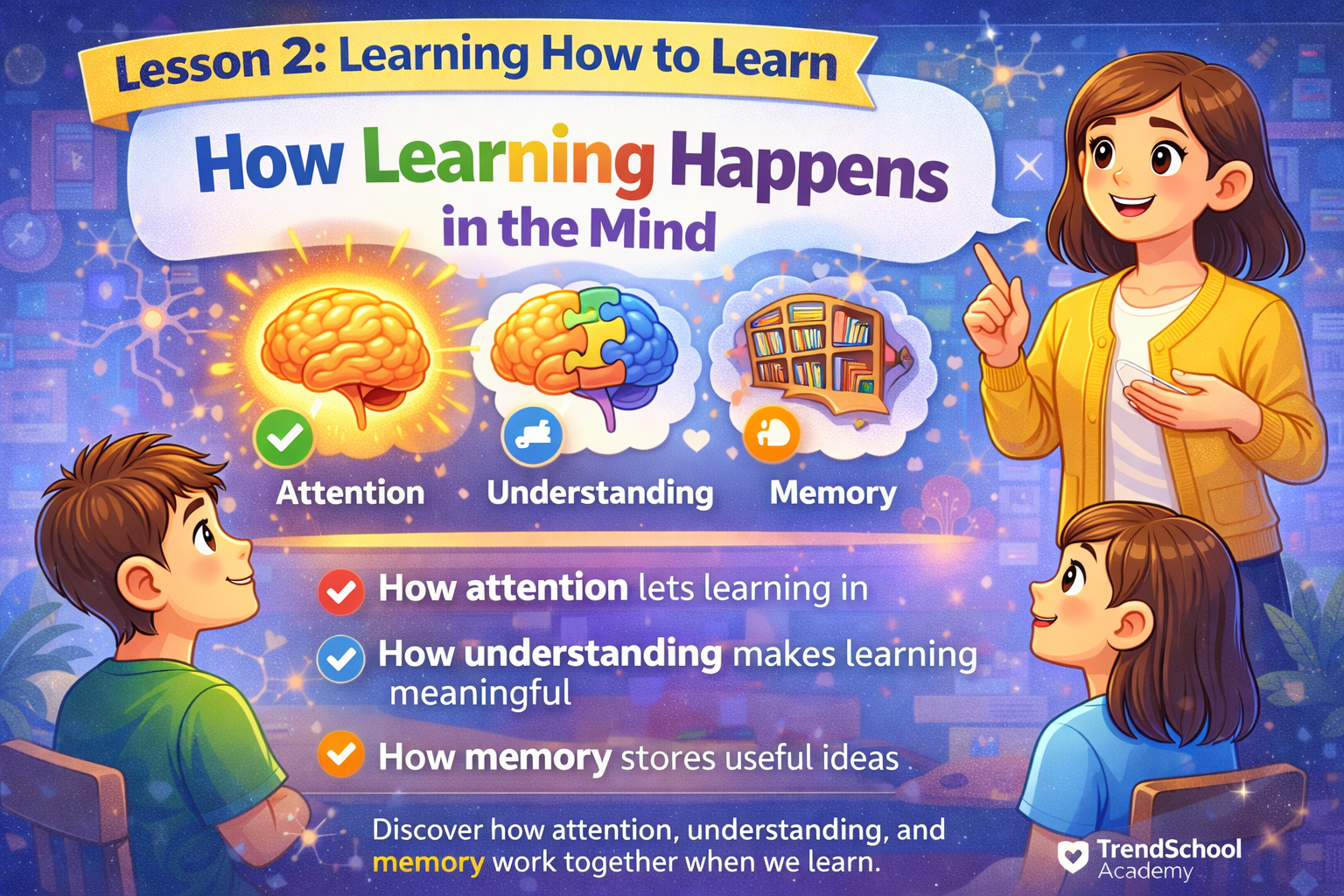 The lesson then introduces memory as a natural result of attention and understanding. Students learn why forgetting happens and why the brain remembers ideas that feel meaningful, repeated, and useful. This removes fear around forgetting and replaces it with practical awareness of how memory works.